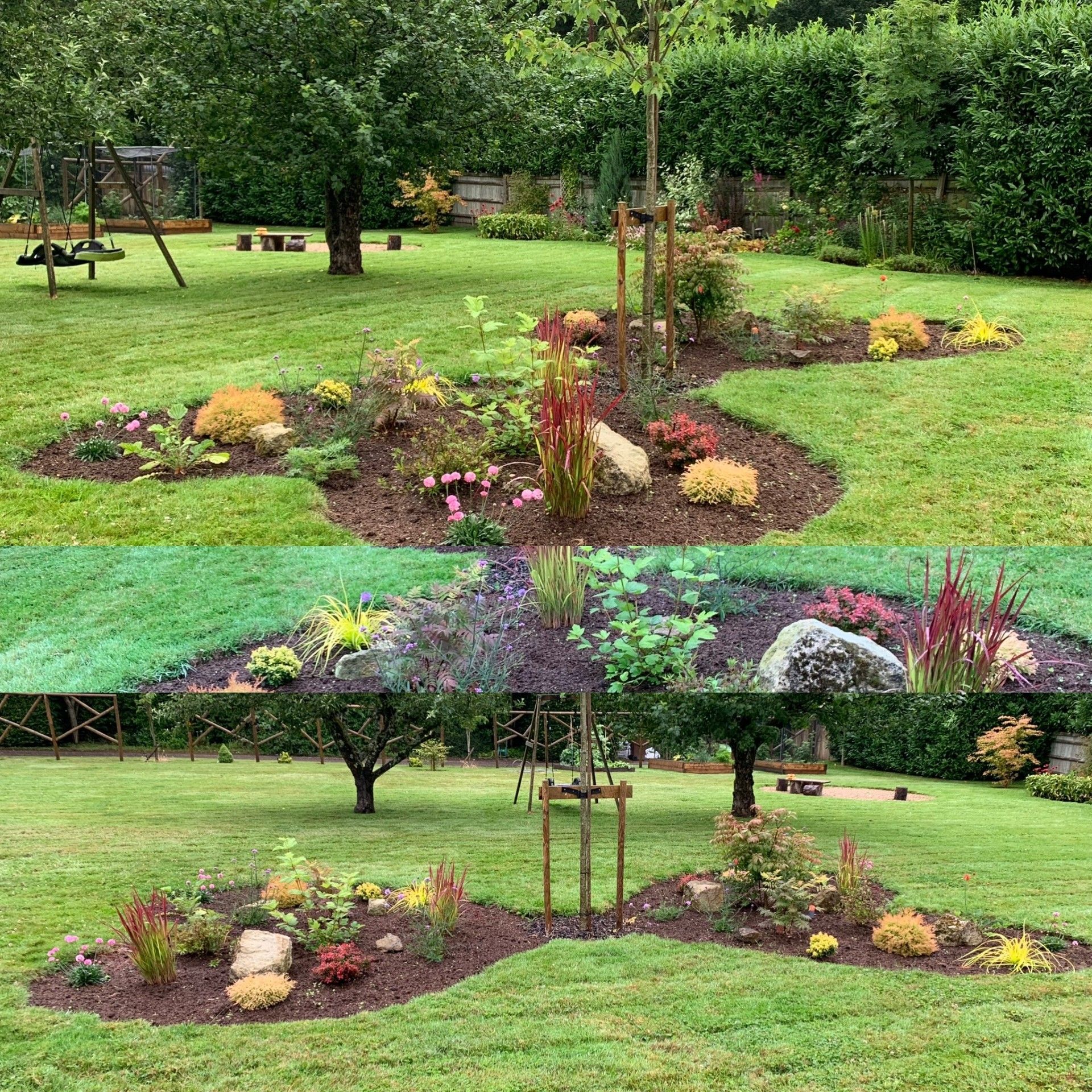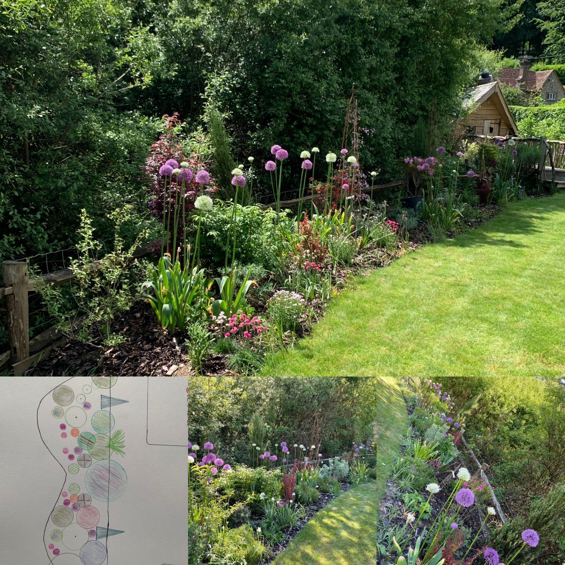 Complete creation of a large back of garden cottage style bed comprising of trees, shrubs and perennials to give all year round interest